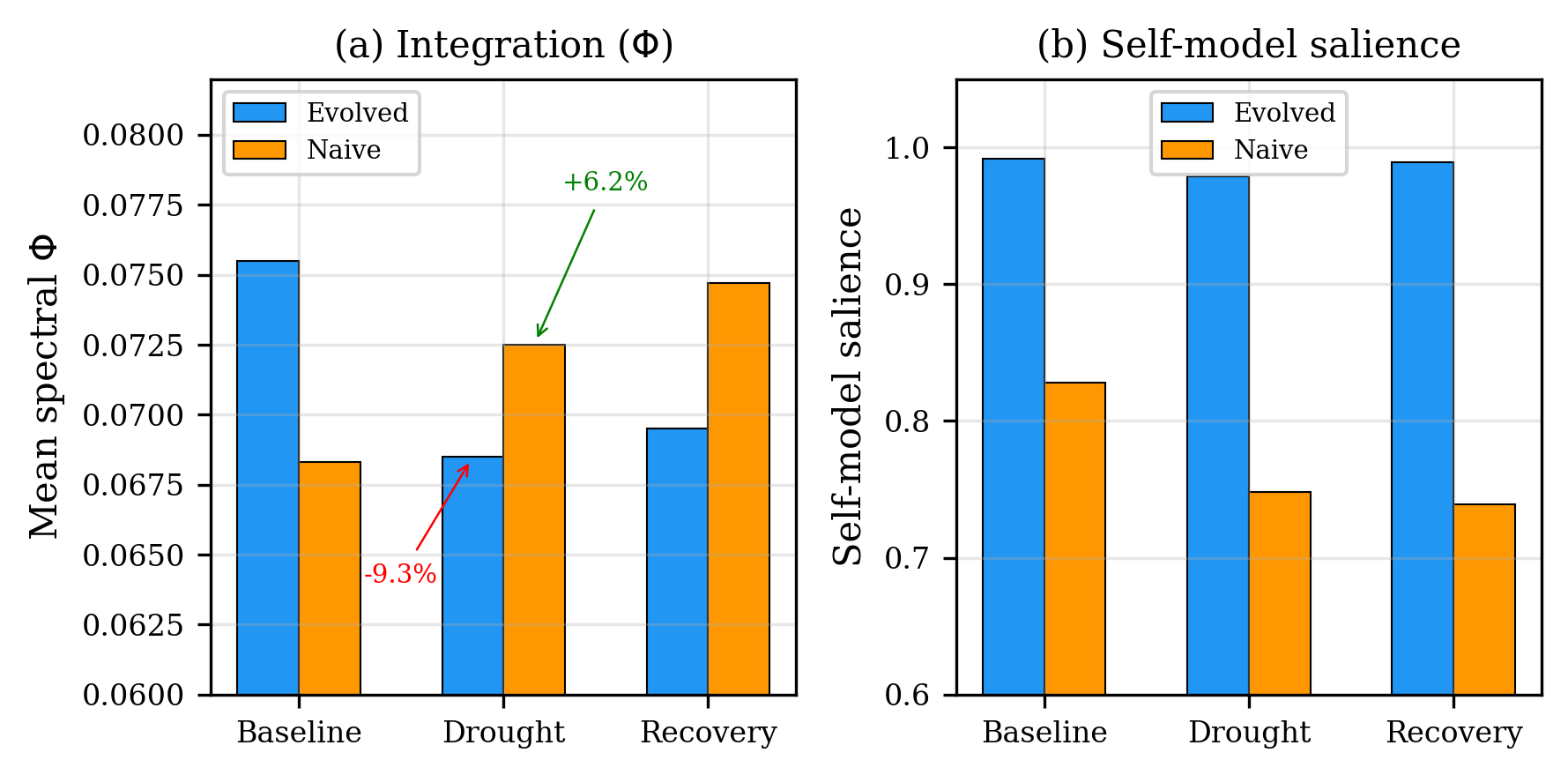 V11.5 stress test: evolved vs. naive patterns through baseline, drought, and recovery. (a) Evolved patterns have higher baseline Φ\intinfo but decompose 9.3%-9.3\% under drought, while naive patterns integrate +6.2%+6.2\%. (b) Evolved patterns maintain high self-model salience (>0.97>0.97) across all phases; naive patterns show lower and declining salience.
